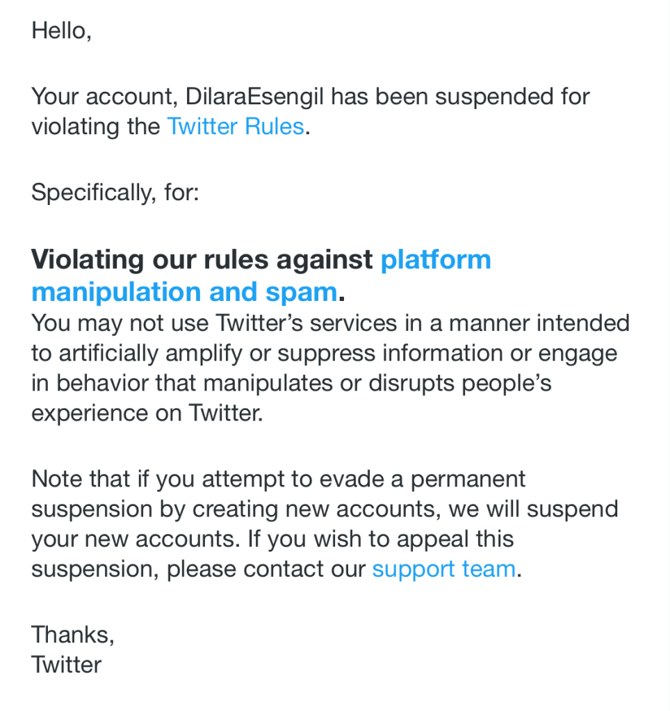 I was just suspended from Twitter today but I am filing an appeal.