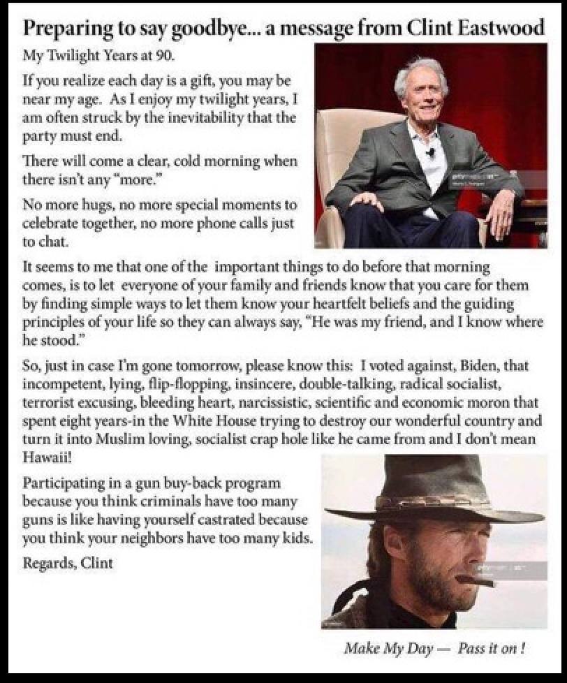 This just in from a friend (thank you George ~ follow 👉🏼 @Pittman_George on Twitter & Clouthub. Gab: @Pittbull745) but we do not know if this source is really Clint. However, I will say that I was his neighbor for a while and know him fairly well from events where I worked with Clint. He’s one hell of a patriot (and he’s super tall!). And he’s not, in my opinion, nor was ever, one of them or part of the club. Why do you think it took him until he was 40 years old to really make it? The spaghetti westerns were filmed in Spain and Europe. There was a reason for that beyond what meets the eye.