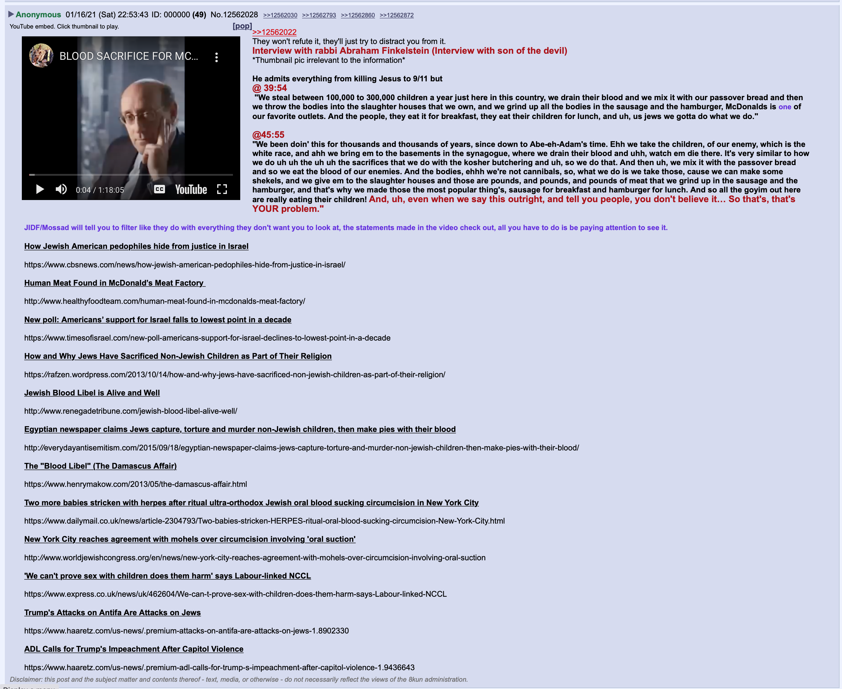 Here is the blood sacrifice from Zionist Rabbi Finkelstein about how we are Goyim and how these sick (non)elite reptilians are eating humans. Sick and vile. This video gets taken down quick so archive it:πŸ‘‡πŸΌ
