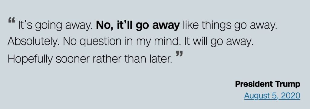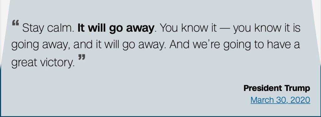 A few days ago, I went back and found an archive of his quotes during the entire COVID mess. Thanks to the fake news media CNN, they have provided an archive here of POTUS’s statements: